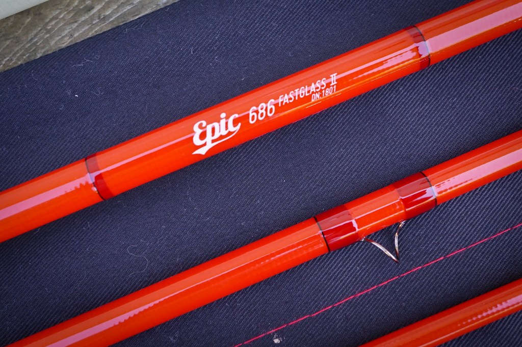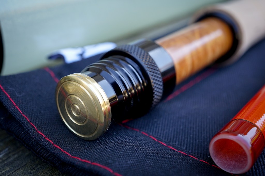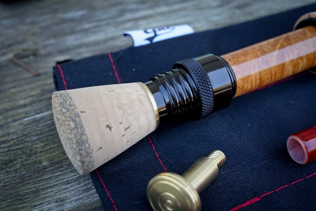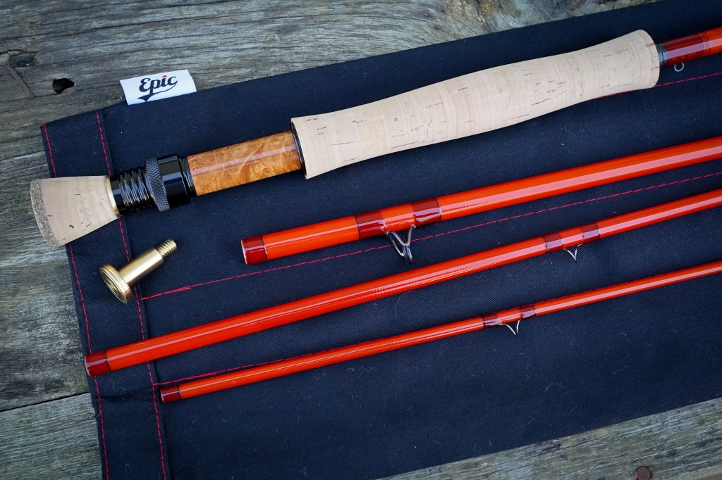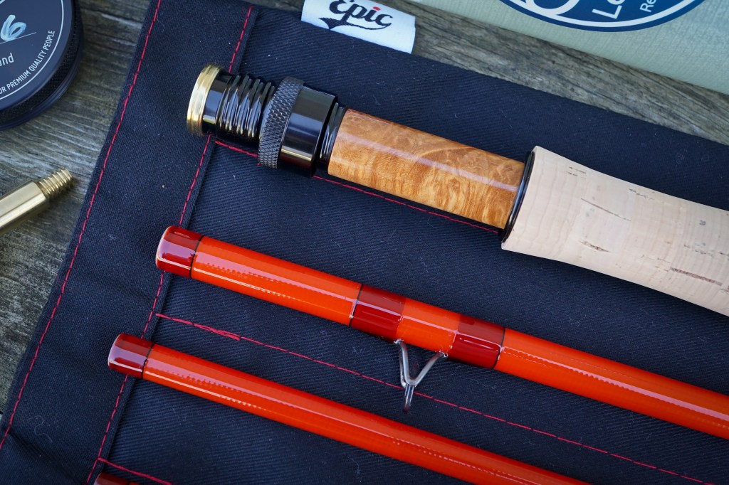 Up for grabs is a recently finished Epic 686 Salsa. Rod is finished with a 6.5″ full wells grip, maple burl seat, and Lemke uplocking hardware. This rod also has a little secret… a shop-made removable fighting butt. The rod has a brass machined sleeve installed inside the seat and hardware. The standard butt cap and fighting butt are both constructed of solid brass and add a nice bit of counterweight to help balance this bigger rod. Wraps are a rust-red tipped black. Glass Epic bag and tube included.
